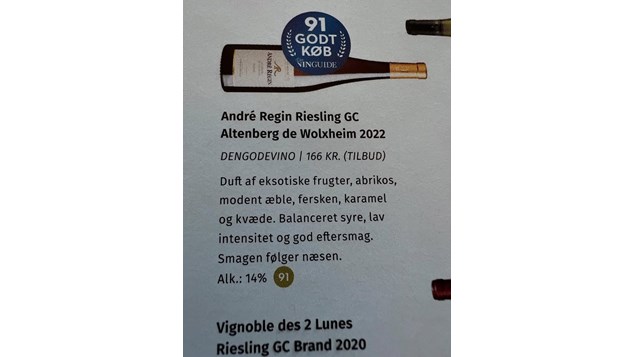 Den aktuelle udgave af “Din Vinguide” har testet Riesling og vi er ikke overraskede, men selvfølgelig stolte over at Alsace Grand Cru Riesling Altenberg de Wolxheim har fået den anderkendelse den fortjener.