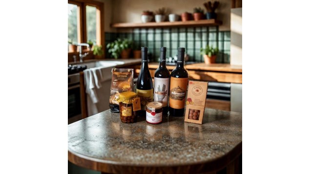 Lækre vin og specialiteter pakkes kan pakke i en gavekurv