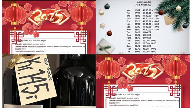 Den Kinesiske Mur og Sushi Scandic tilbyder begge nytårs sushi menuer, som kan bestilles til afhentning den 31. december. Der er to menuer at vælge imellem, med priser fra 528 kr. til 688 kr. Bestilling kan foretages via deres hjemmeside eller telefon.